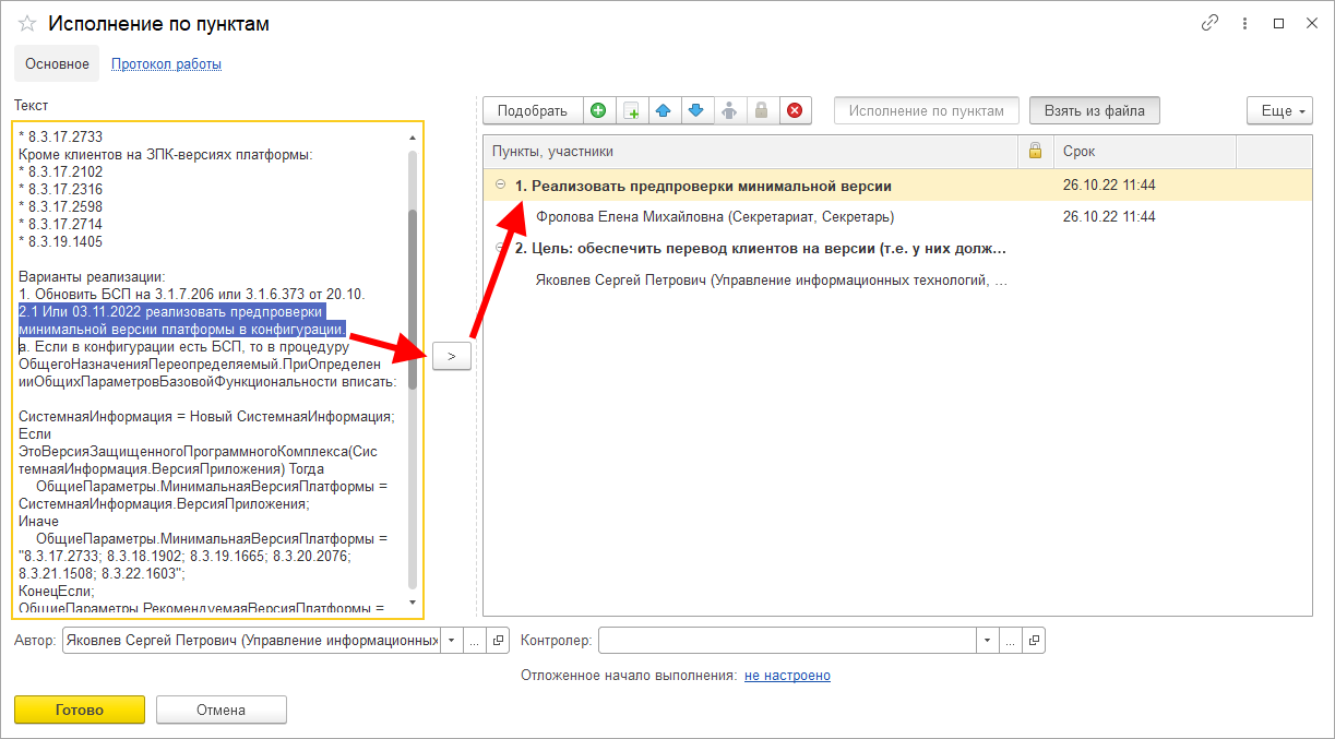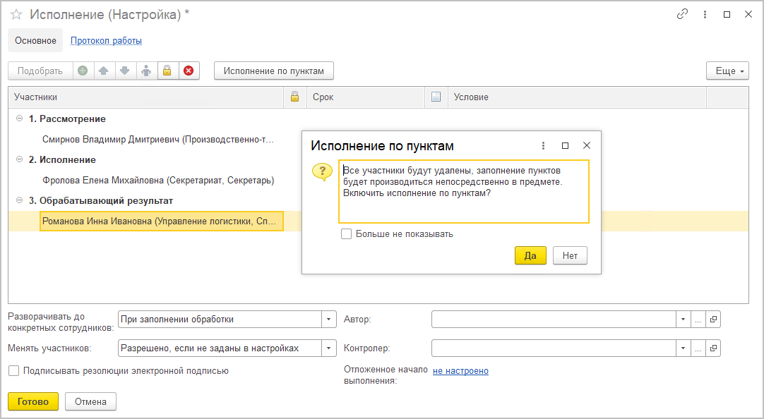 Теперь в действиях исполнения при переходе на исполнение по пунктам больше не отображается излишнее предупреждение программы. Вместо него все участники автоматически перемещаются на первый пункт.
