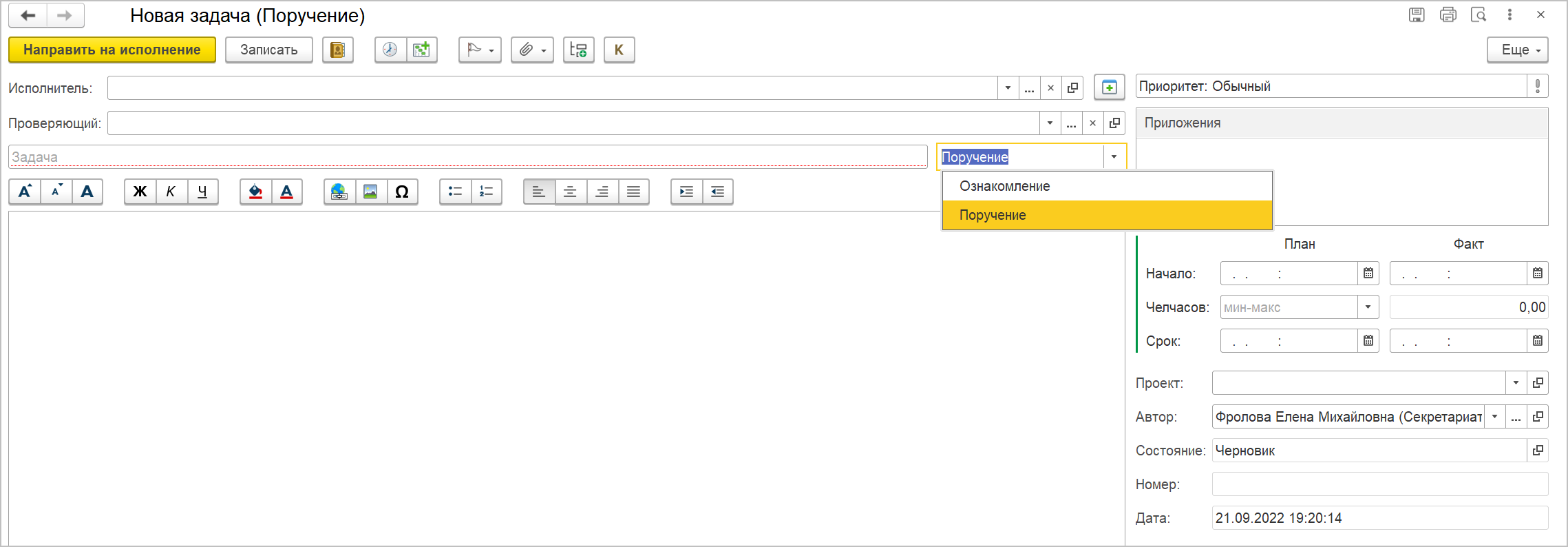Для этого в карточке новой задачи или подзадачи необходимо выбрать вид Ознакомление. Изменить вид можно только до отправки задачи на исполнение.