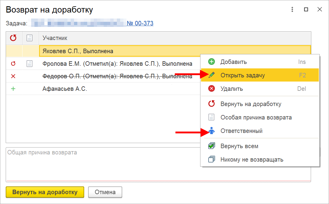 Для этого при выполнении автором задачи или проверяющим команды Вернуть на доработку откроется окно выбора участников.