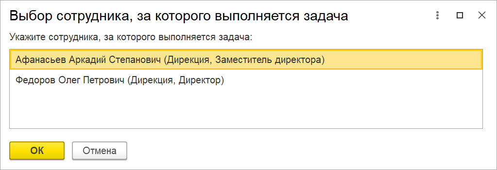 Теперь если задача направлена на роль и текущий сотрудник является помощником / замещающим нескольких исполнителей этой роли – программа попросит выбрать, от чьего имени взять задачу в работу.