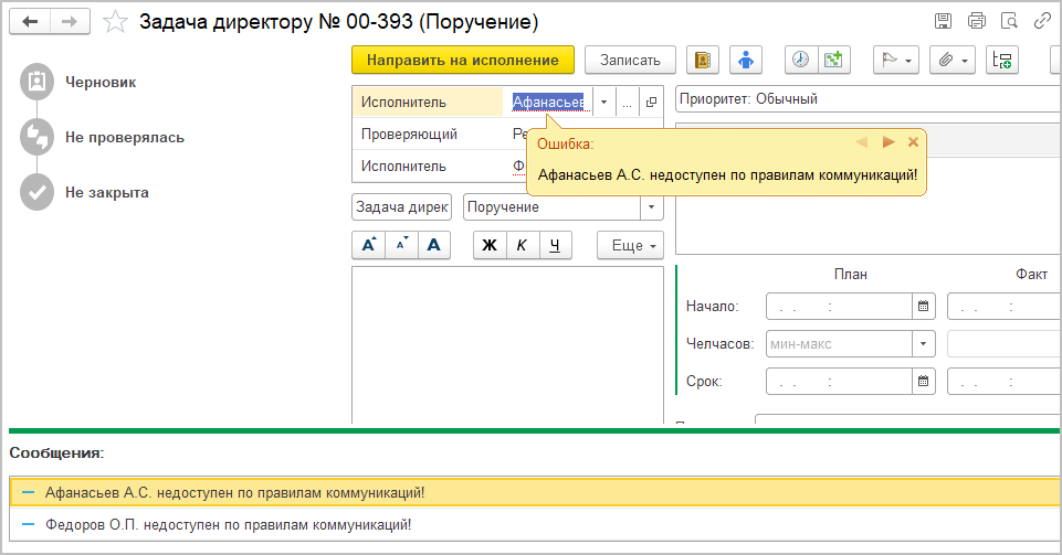 В новой версии программы появилась дополнительная защита от нарушения правил коммуникаций. Теперь при направлении задачи на исполнение и ознакомление программа проверяет доступны ли ее участники по правилам коммуникаций.