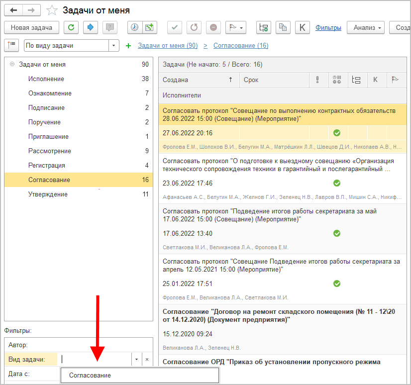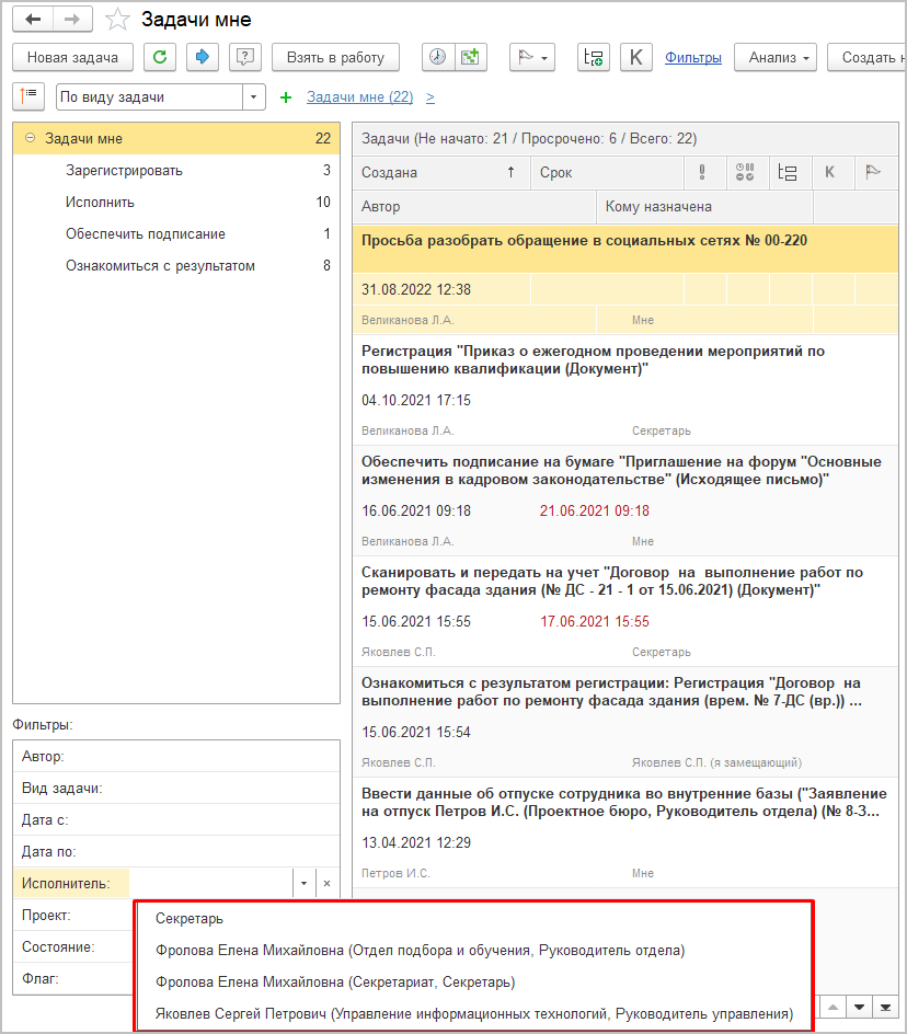 Например, для списка Задачи мне список выбора фильтра Исполнитель будет ограничен сотрудниками и ролями текущего пользователя, а также сотрудниками, для которых он является замещающим или помощником.