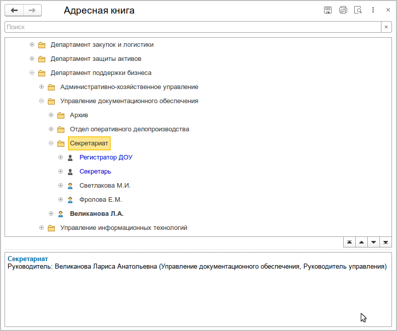 Новый вариант определения руководителей учтен в прочих возможностях программы. Например, при использовании автоподстановки Непосредственный руководитель ответственного за документ будет подставлен сотрудник, который руководит подразделением ответственного за документ с учетом описанной выше логики. А при отправке уведомления об отсутствии в адресаты письма будут включены все сотрудники, относящиеся к подразделению отсутствующего, а также руководитель этого подразделения, даже если у руководителя в карточке сотрудника указано другое подразделение.