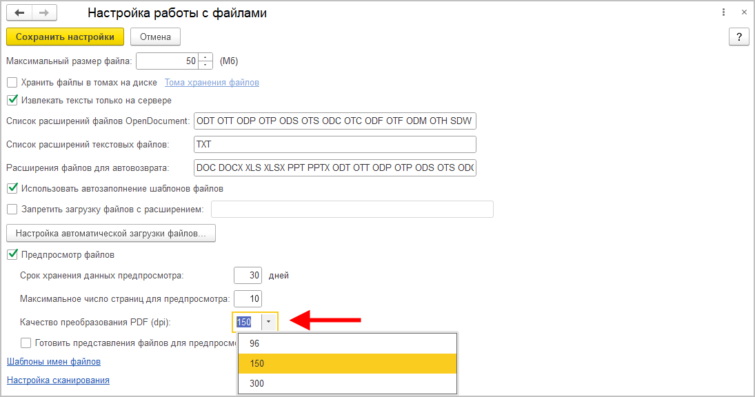Для настройки качества это настройка работы с файлами Качество преобразования PDF (dpi). По умолчанию установлено среднее значение – 150 dpi.