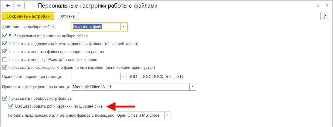 Для масштабирования файла по ширине экрана или в реальном размере предусмотрена персональная настройка Масштабировать PDF и картинки по ширине окна.