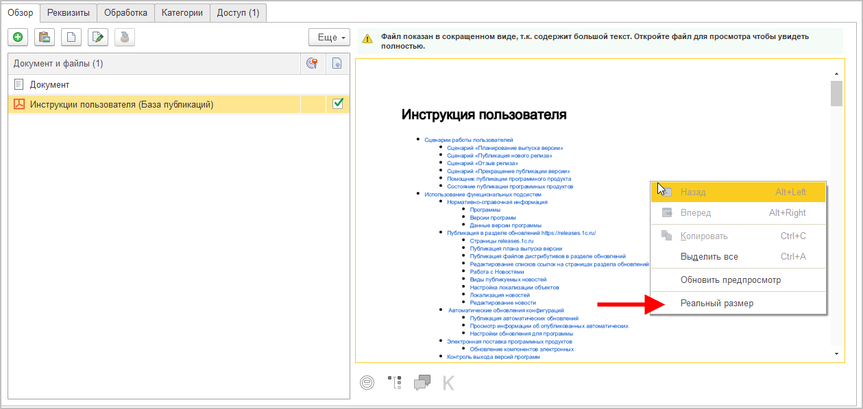 Вариант масштабирования можно переключить также в окне предпросмотра карточки документа: Вписать по ширине окна или Реальный размер. Возможность доступна только для PDF-файлов и изображений.