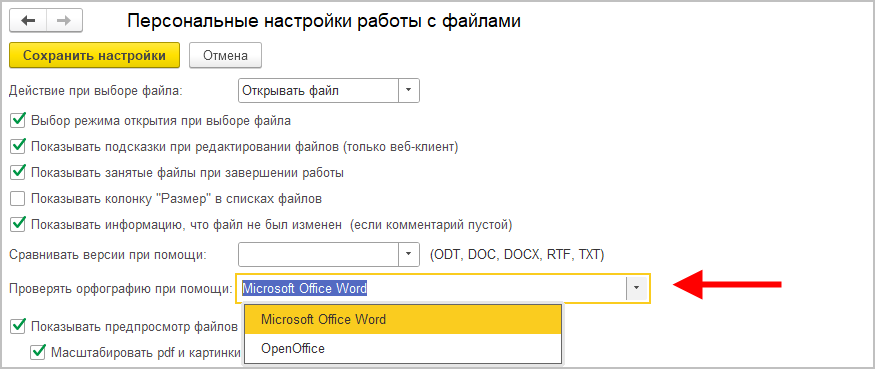 Выбрать вариант проверки орфографии можно персональной настройкой Проверять орфографию при помощи.