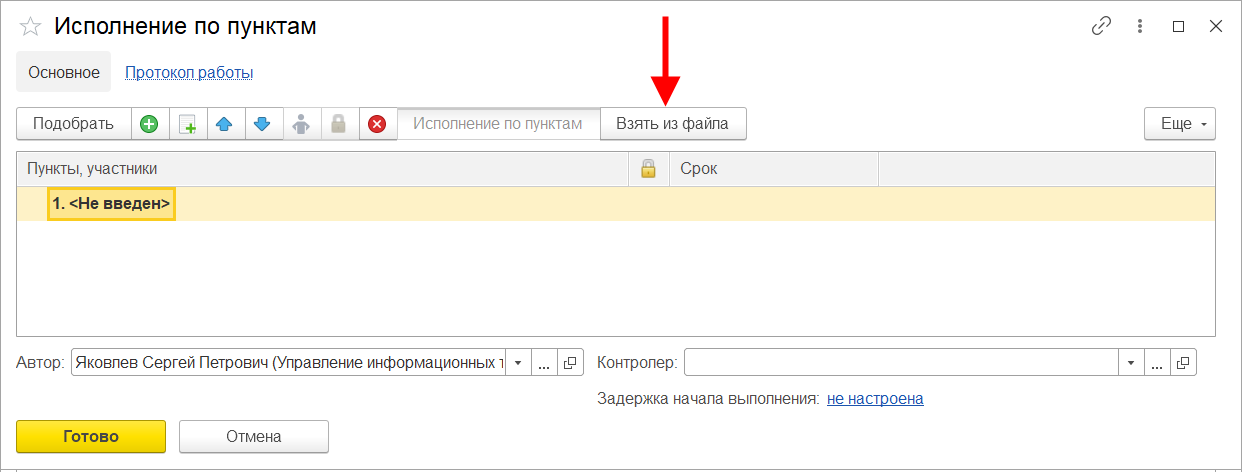 Теперь пункты исполнения можно автоматически заполнить из файла. Для этого на командной панели карточки действия Исполнение по пунктам доступна команда Взять из файла.