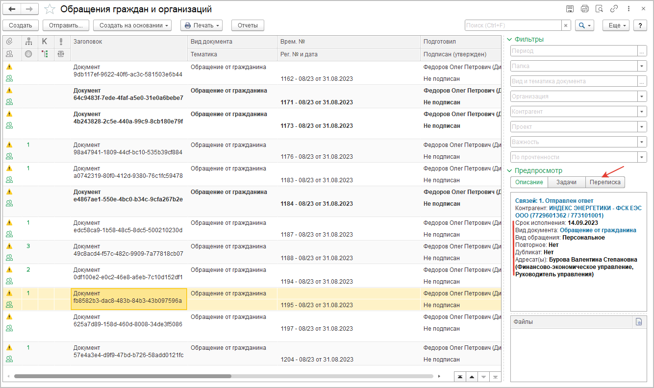 ■ отображается новая закладка Переписка, где видны ответные документы по одному выделенному в списке обращению.