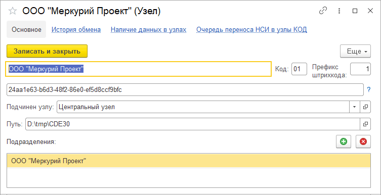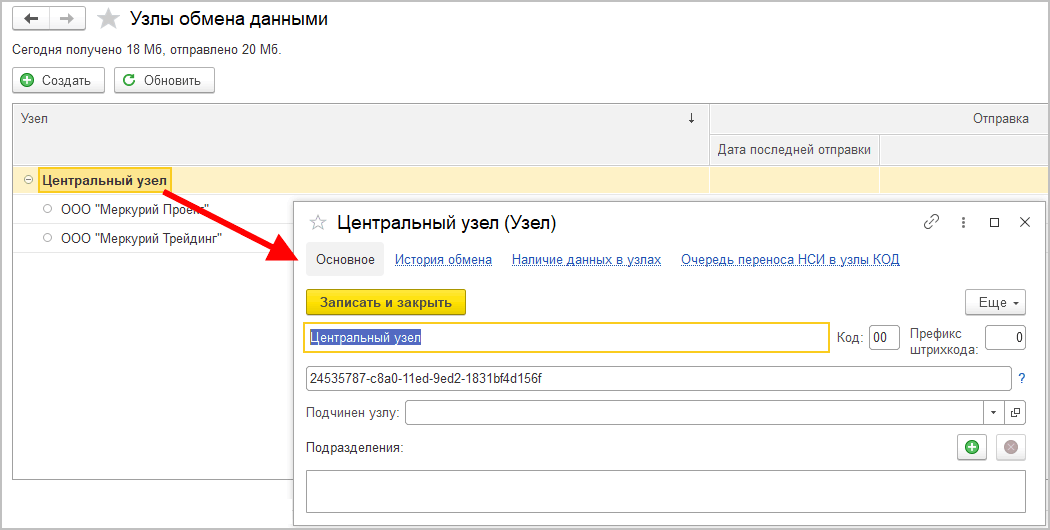 4. В списке Узлы обмена данными (Настройка – Контролируемый обмен данными) открыть карточку элемента Этот узел, соответствующую текущему узлу – он выделен жирным шрифтом. Присвоить «говорящее» наименование и произвольный код (например, «Центральный узел» и «00»).