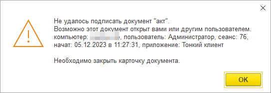 ■ Теперь для задач подписания, регистрации, утверждения, прямо в момент выполнение задачи (если карточка документа открыта в другом сеансе) программа выдает сообщение и не дает выполнить задачу. Это сокращает число проблем, когда задание зависает в очереди обработки из-за блокировки карточка документа.