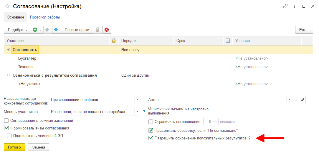 Новый режим согласования включается в правилах обработки для действия Согласование настройкой Разрешить сохранение положительных результатов.