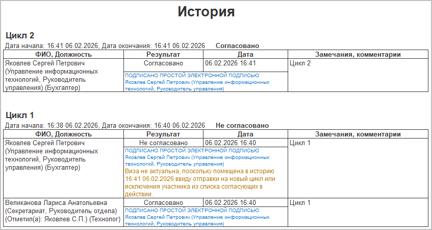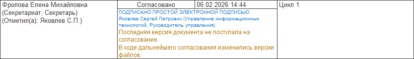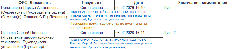 Если согласование проходило в новом режиме сохранения результатов и сохранена виза предыдущего цикла, то в листе согласования появится соответствующая надпись.