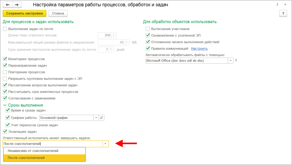 В новой версии программы можно регулировать возможность ответственного завершать задачу / поручение, если не выполнены задачи соисполнителей. Для этого в разделе Настройка программы – Процессы, обработки, задачи появилась настройка Ответственный исполнитель может завершать задачи.