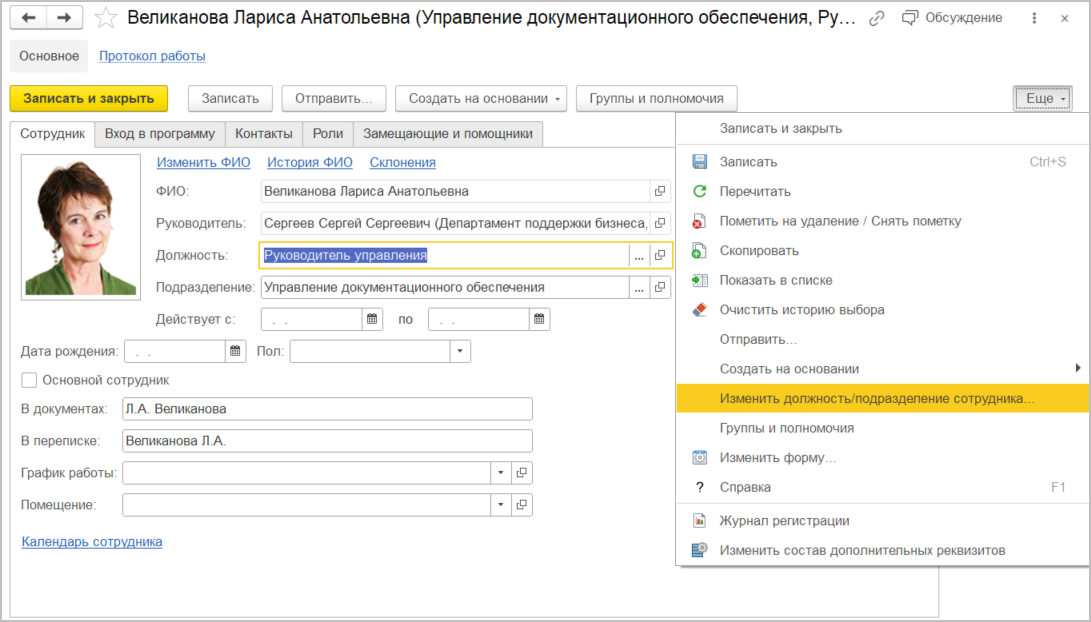 Теперь для быстрого запуска помощника перевода в меню Еще списка и карточки сотрудника предусмотрена команда Изменить должность/подразделение сотрудника. Команда доступна пользователю с полными правами.