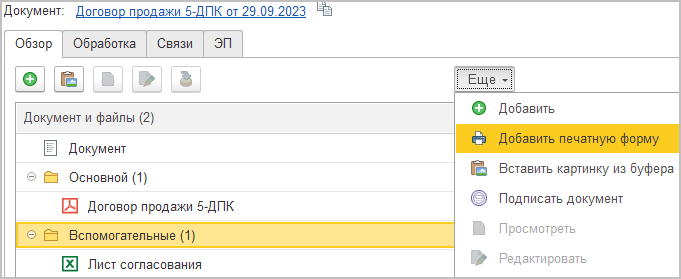 Если у объекта интегрируемого прикладного решения есть печатные формы, а их автоматическое добавление по каким-то причинам нежелательно, их можно добавить вручную в виде приложенных файлов, выбрав команду Добавить печатную форму в подменю Еще списка файлов.