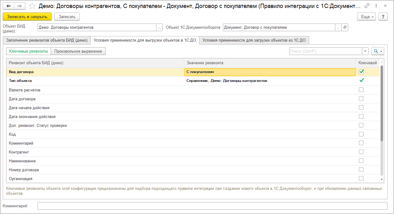 1. В простых сценариях можно указать Ключевые реквизиты. Флажок Ключевой указывает, что правило интеграции будет применяться только для объектов с указанным значением реквизита. Например, для договоров ключевым будет реквизит Вид договора, а ключом будет являться его значение. Если в конкретном договоре интегрируемого прикладного решения будет указан вид С покупателем, то система подберет такое правило интеграции, в таблице ключевых реквизитов которого стоит значение С покупателем, и создаст в 1С:Документообороте документ вида Договор с покупателем. Аналогично, если в конкретном договоре будет указан вид С поставщиком, то система подберет правило интеграции, соответствующее виду документов Договор с поставщиком. При необходимости можно указать сразу несколько ключевых реквизитов, в таком случае правило будет подходить конкретному объекту интегрируемого прикладного решения, если значения всех указанных реквизитов будут совпадать.