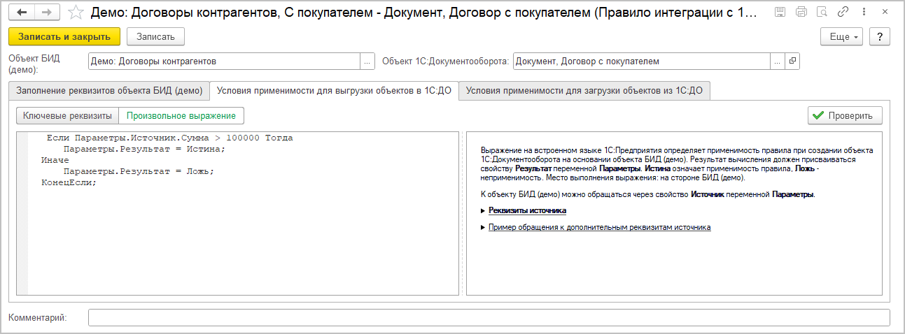 Выражение будет выполняться на стороне интегрируемого прикладного решения. Результат вычисления должен присваиваться свойству Результат переменной Параметры. Значение Истина говорит о применимости правила, Ложь – о неприменимости. К объекту интегрируемого прикладного решения можно обращаться через свойство Источник переменной Параметры.