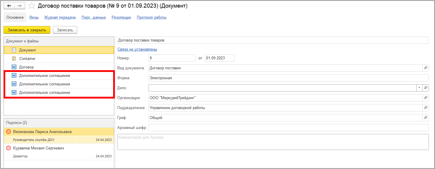 В новой версии программы поддерживается работа с несколькими визами сотрудника в документе. Это удобно, например, при совмещении должностей. Ранее при выгрузке в 1С:Архив виза сотрудника могла быть только одна.