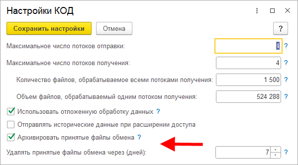 В новой версии программы можно архивировать и удалять обработанные файлы обмена. Для этого в настройках КОД появились соответствующие настройки.