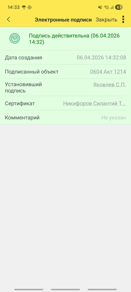 4. После того как программа найдет сертификат с тем же отпечатком, что и на сервере – документ будет подписан.