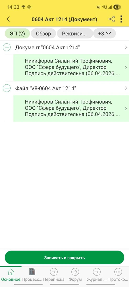 Для этого на вкладке Документооборот предусмотрена закладка ЭП со списком электронных подписей и командной панелью (Открыть, Проверить, Проверить все, Сохранить в файл и др.).