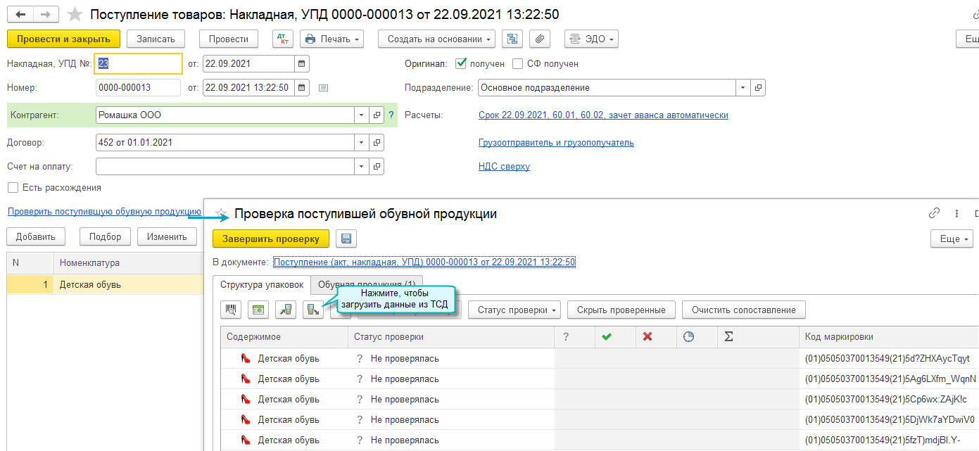 Откройте документ поступления с кодами маркировки продавца и загрузите фактические данные по поступившему товару из терминала сбора данных.
