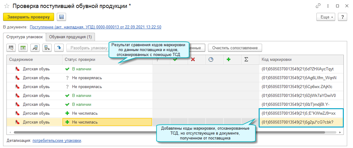 Также доступна выгрузка поступивших кодов маркировки в терминал сбора данных. Тогда проверку кодов маркировки можно выполнить непосредственно в терминале сбора данных.