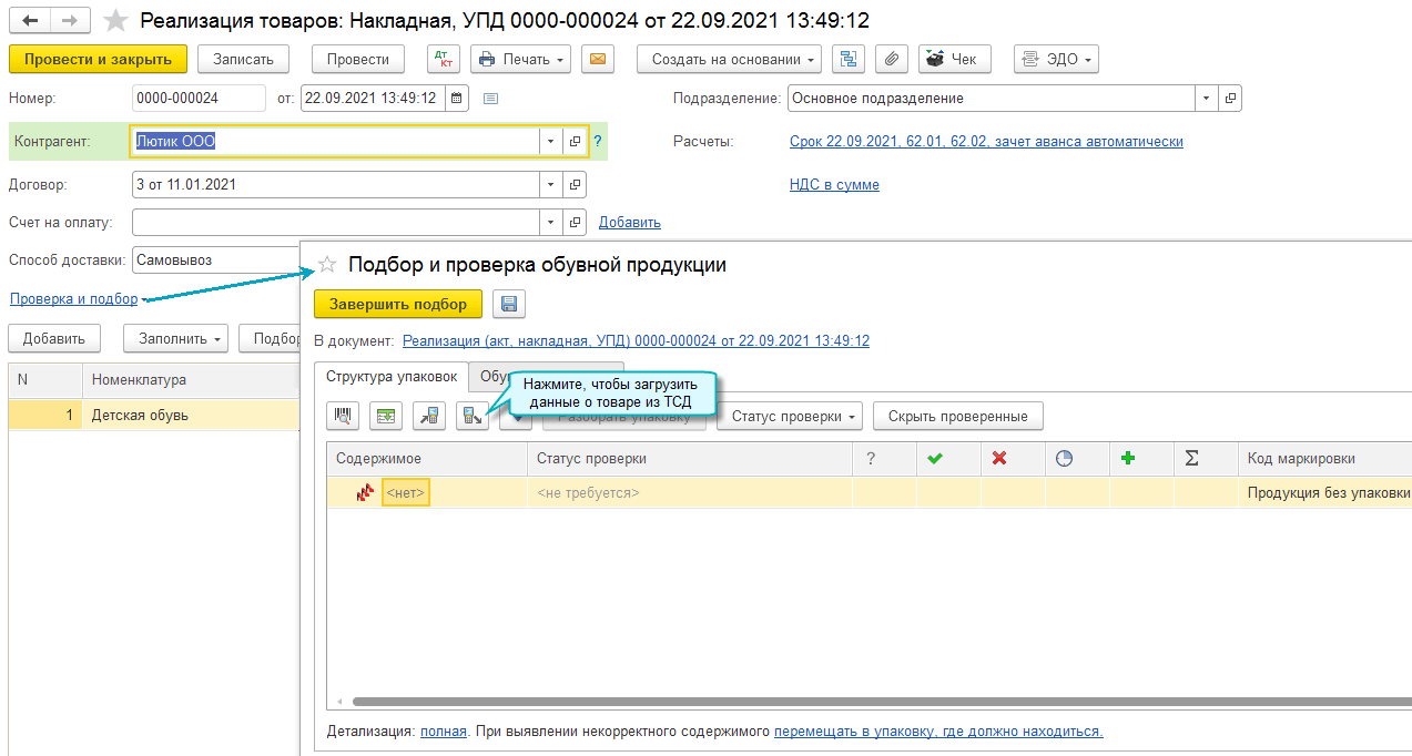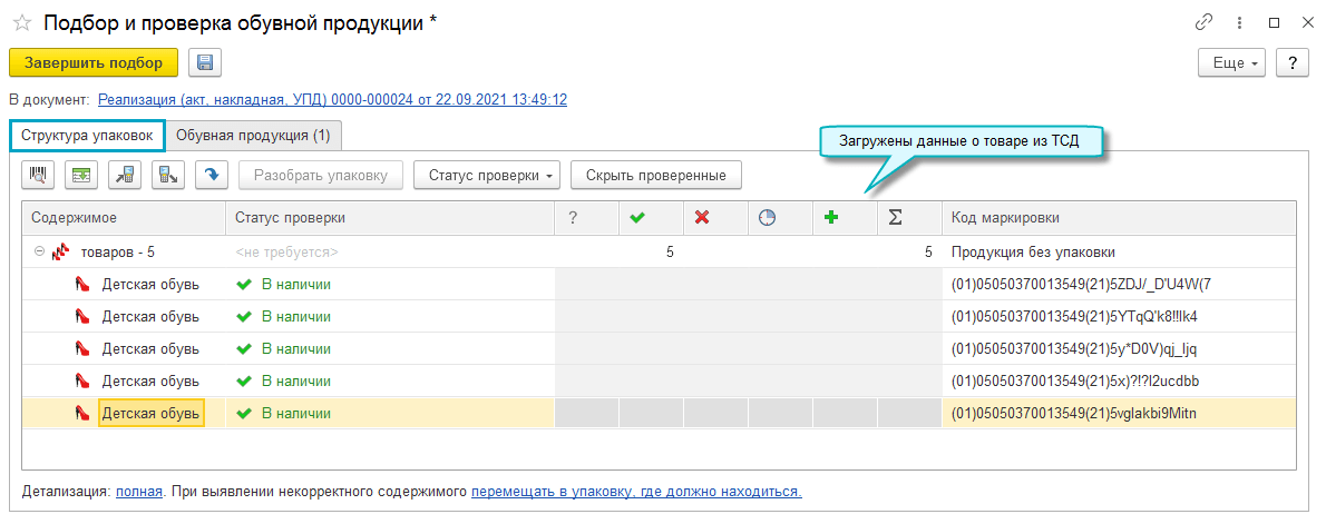 Также доступна выгрузка кодов маркировки в терминал сбора данных, если товар предварительно подбирается в документе. Тогда проверку кодов маркировки можно выполнить непосредственно в терминале сбора данных.