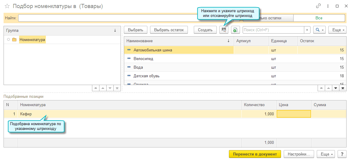 Добавлена возможность подбирать товары с помощью сканера штрихкода. Это доступно во всех документах, где выполняется подбор номенклатуры.