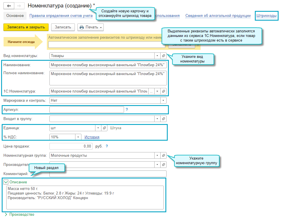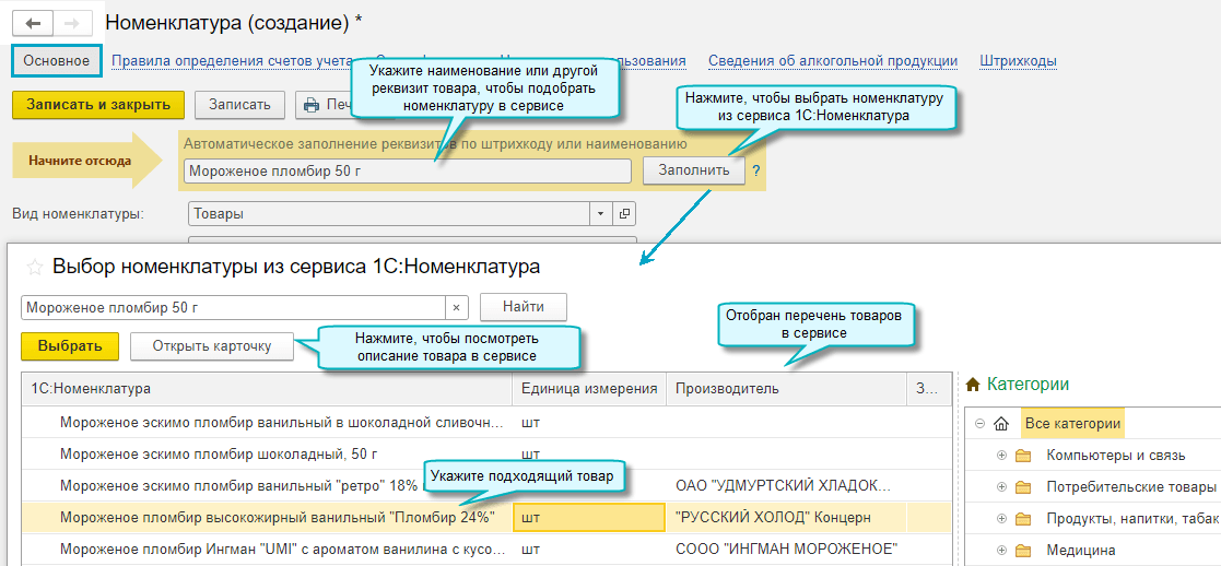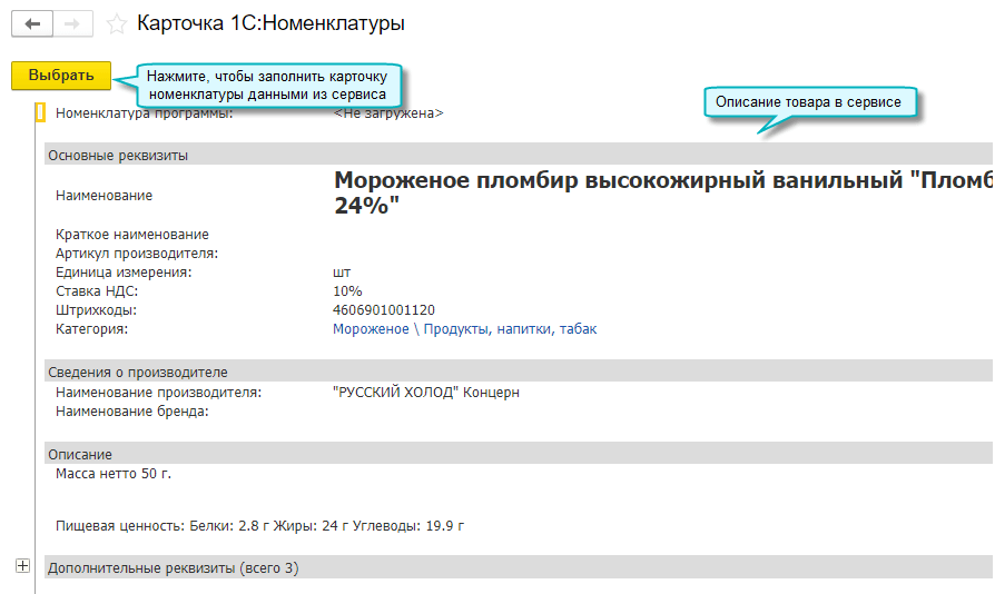 В карточку новой номенклатуры загружаются данные карточки 1С:Номенклатуры, если поставщик использует сервис 1С:Номенклатура.
