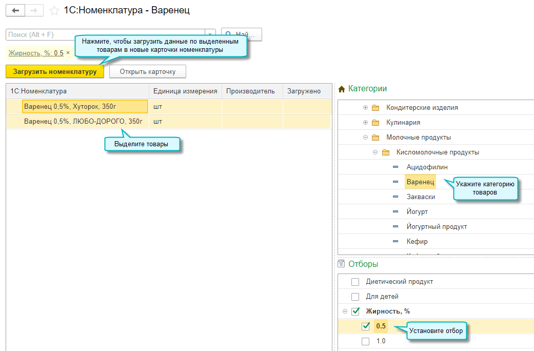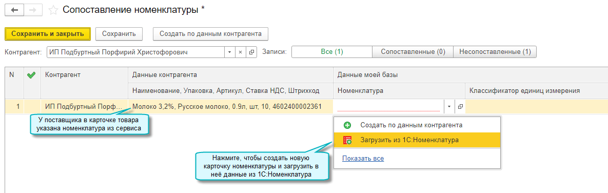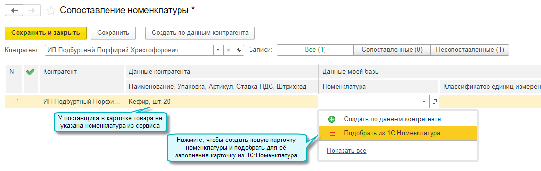 Также выполняется поиск подходящей карточки 1С:Номенклатуры, если поставщик не использует сервис 1С:Номенклатура.