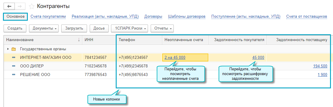 Добавлены колонки с телефоном, неоплаченными счетами и остатками по взаиморасчетам в список контрагентов в простом интерфейсе.