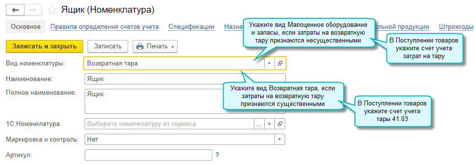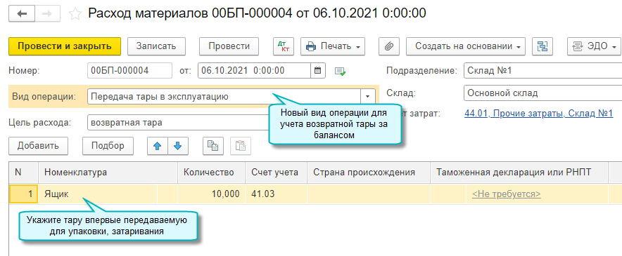 Добавлена возможность учета за балансом возвратной тары, использованной для упаковки товаров. Новая тара, не переданная в эксплуатацию, учитывается на счете 41.03 "Тара под товаром и порожняя".