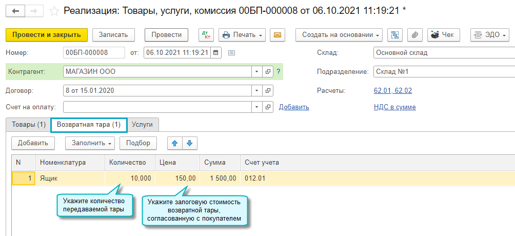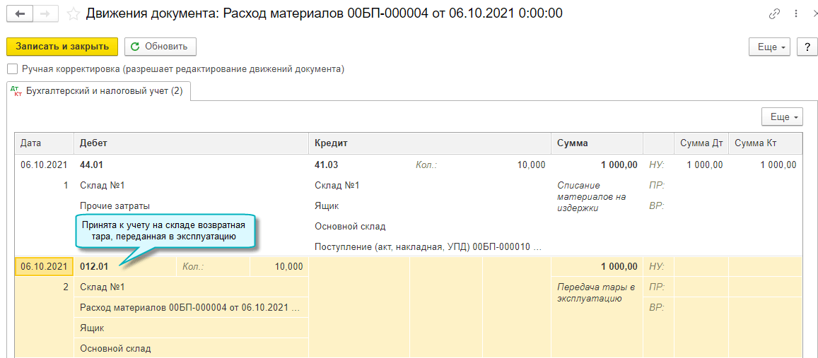 В полном интерфейсе операция по передача возвратной тары в эксплуатацию также может быть отражена документом Передача материалов в эксплуатацию, в который добавлена соответствующая закладка Возвратная тара.