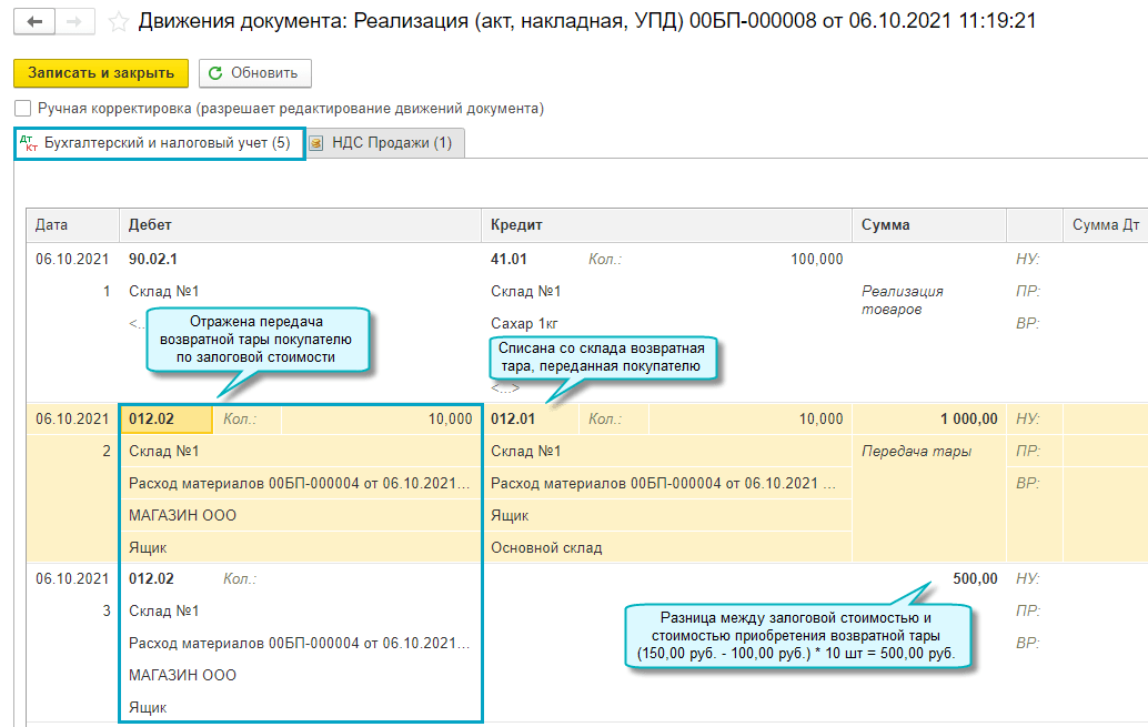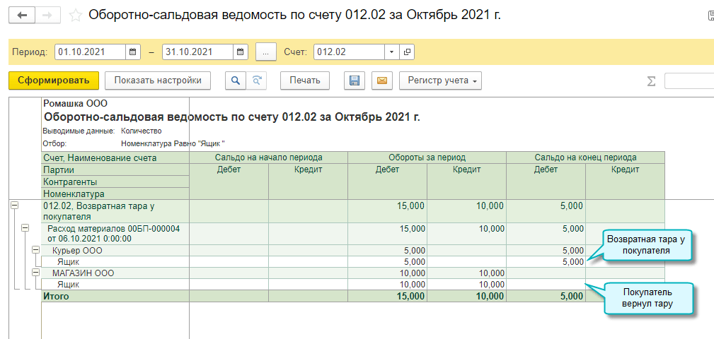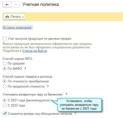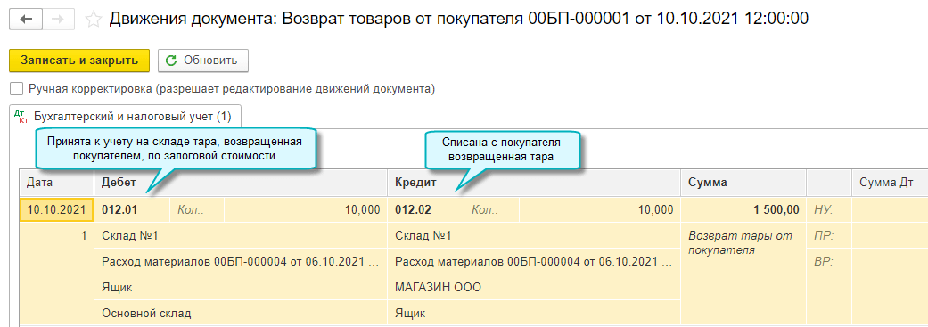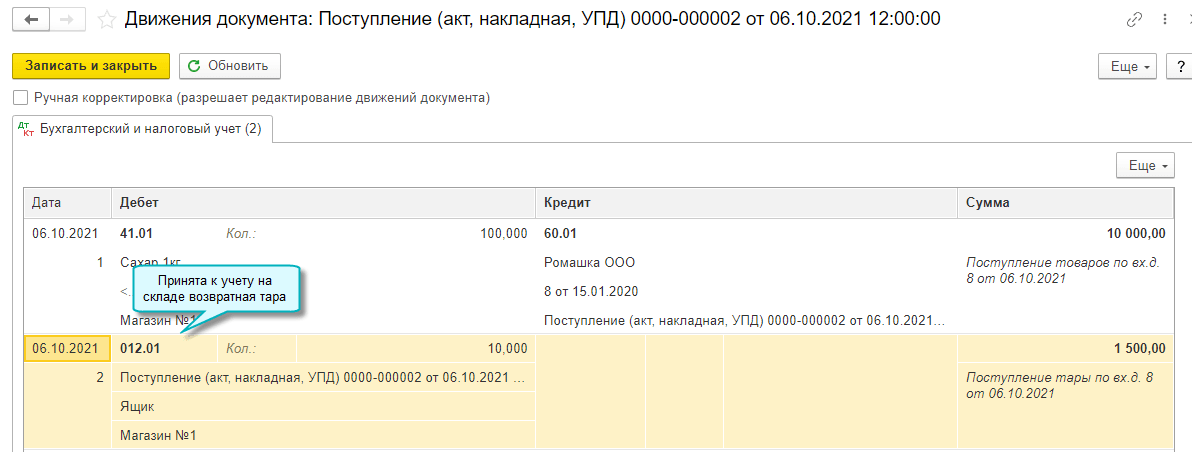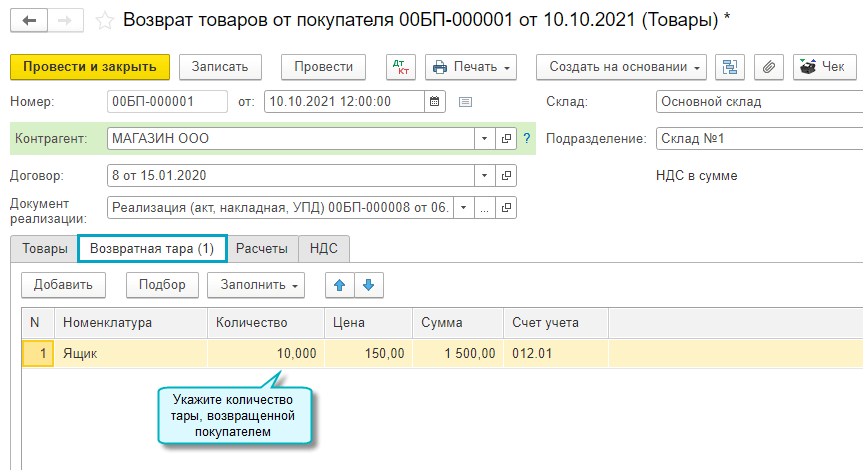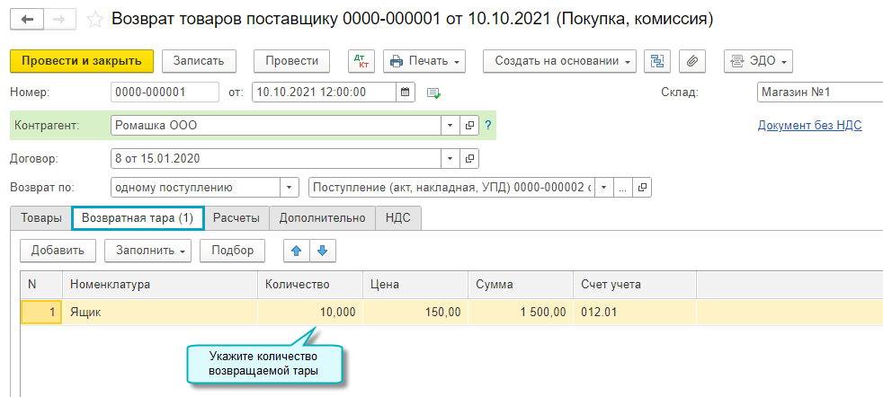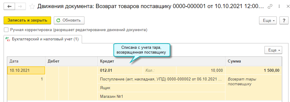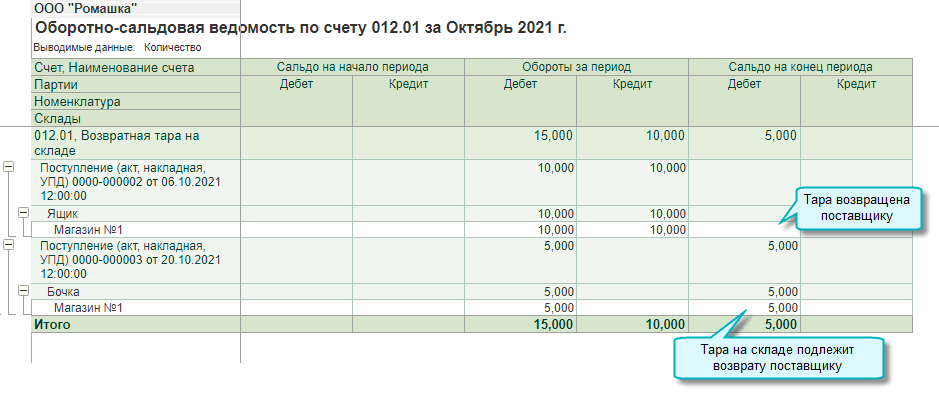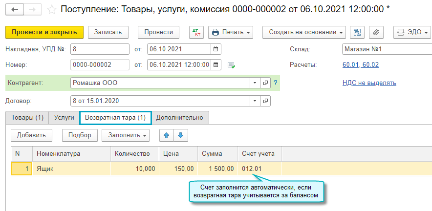 Добавлена возможность учета возвратной тары поставщика за балансом. Организация при покупке товаров в возвратной таре учитывает возвратную тару поставщика за балансом, поскольку тара остается собственностью поставщика и подлежит возврату.