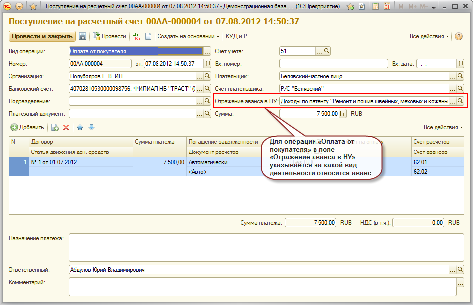 Документ "Поступление на расчетный счет"