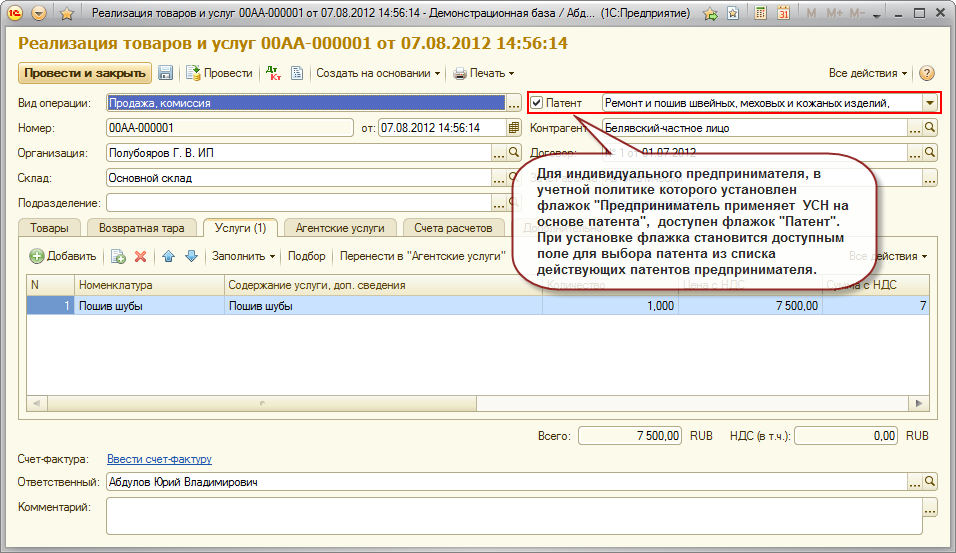 Документ "Реализация товаров и услуг"