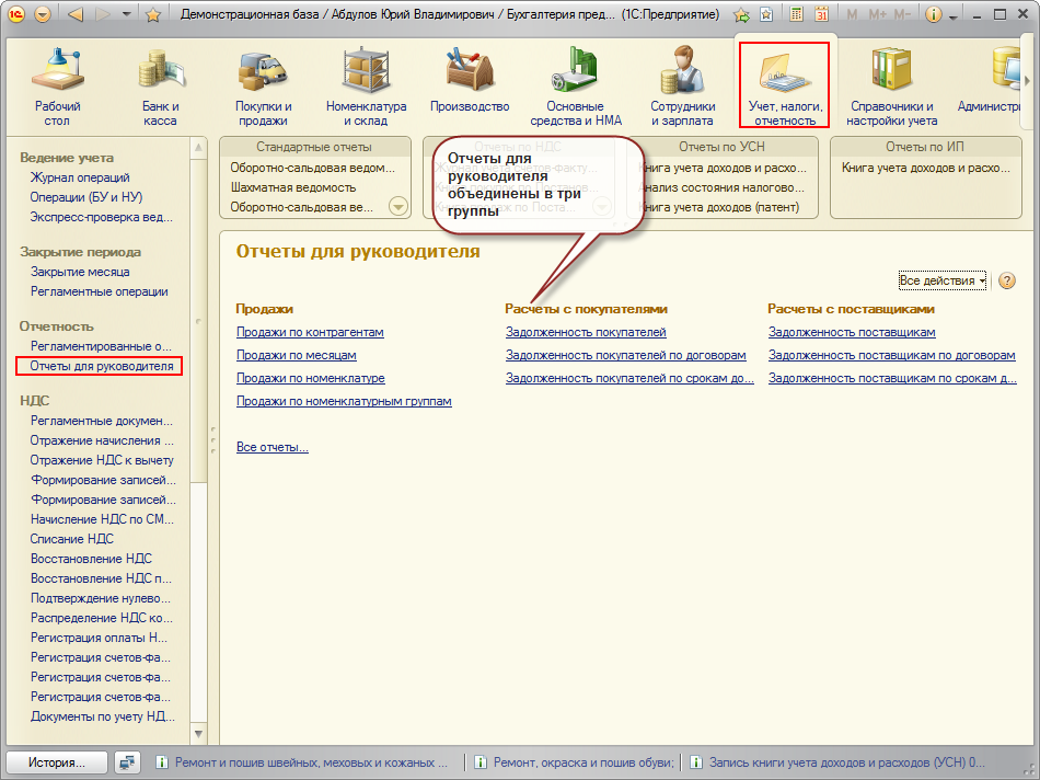 Отчеты расположены на форме "Отчеты для руководителя" в разделе "Учет, налоги, отчетность"