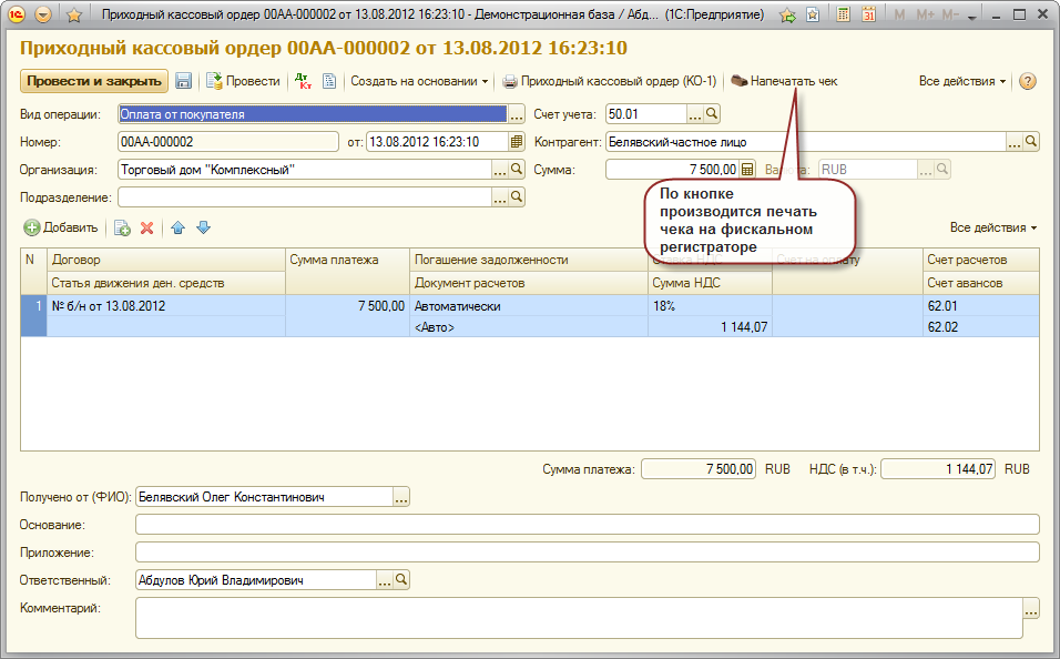 Документ "Приходный кассовый ордер"