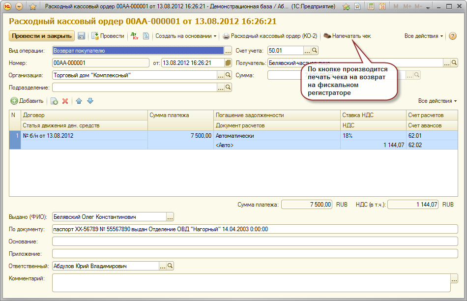 Документ "Расходный кассовый ордер"