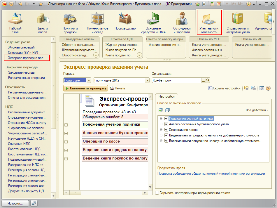 Экспресс-проверка ведения учета – средство, помогающее пользователю в любой момент времени получить сводную и детализированную информацию о корректности данных.