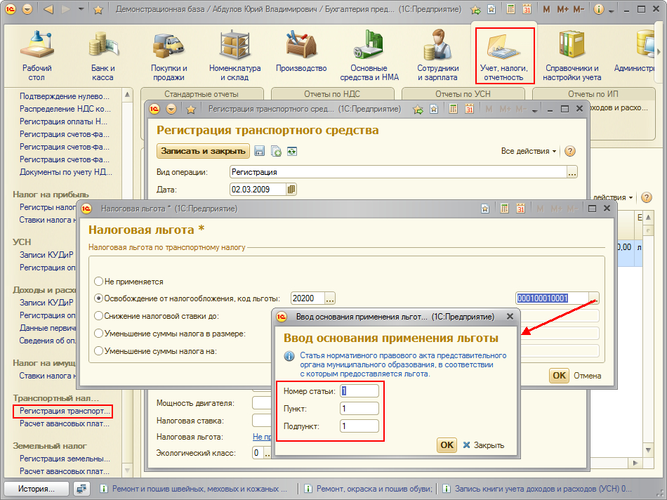 При указании налоговой льготы по транспортному налогу указывается основание предоставление льготы - номер статьи пункта и подпункта правового акта представительного органа муниципального образования.