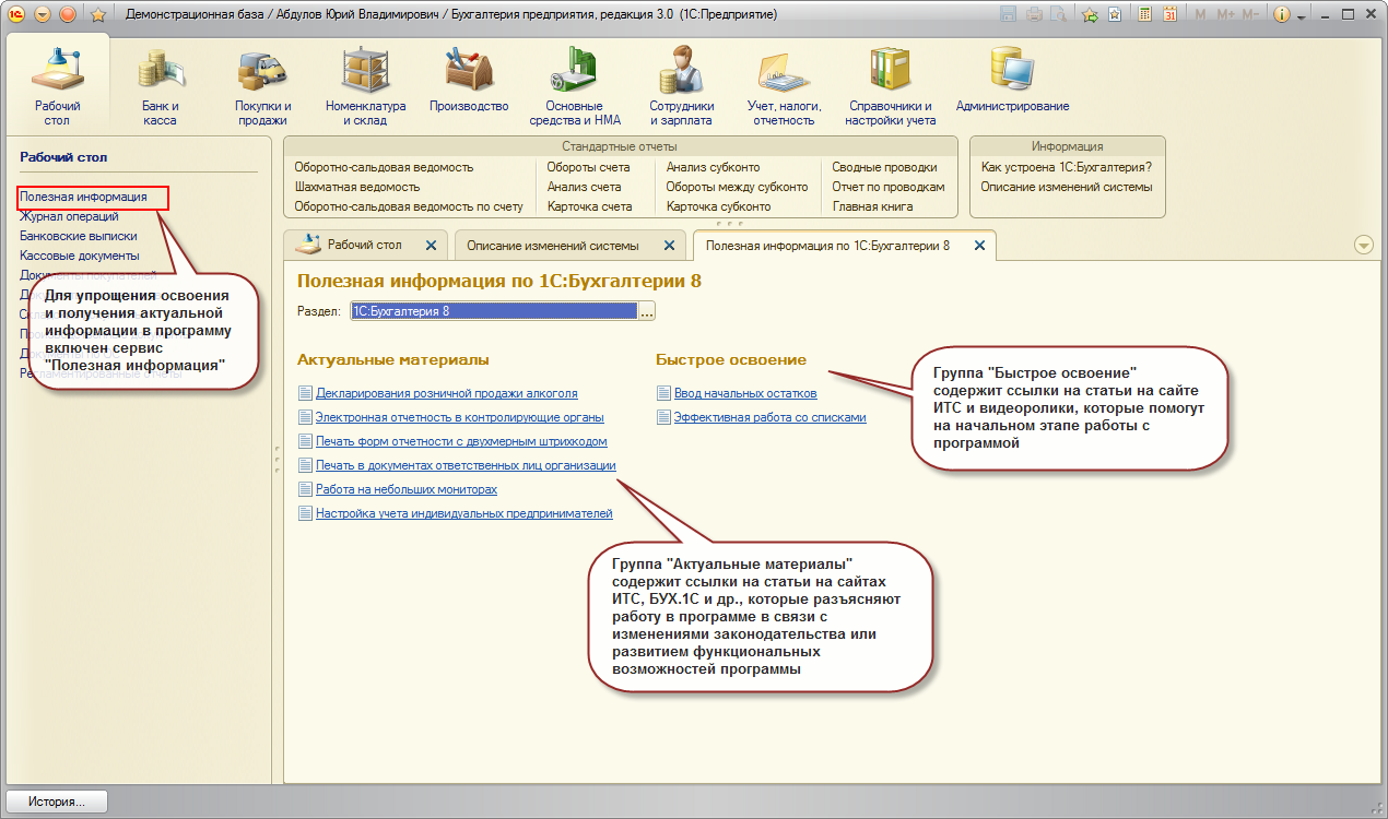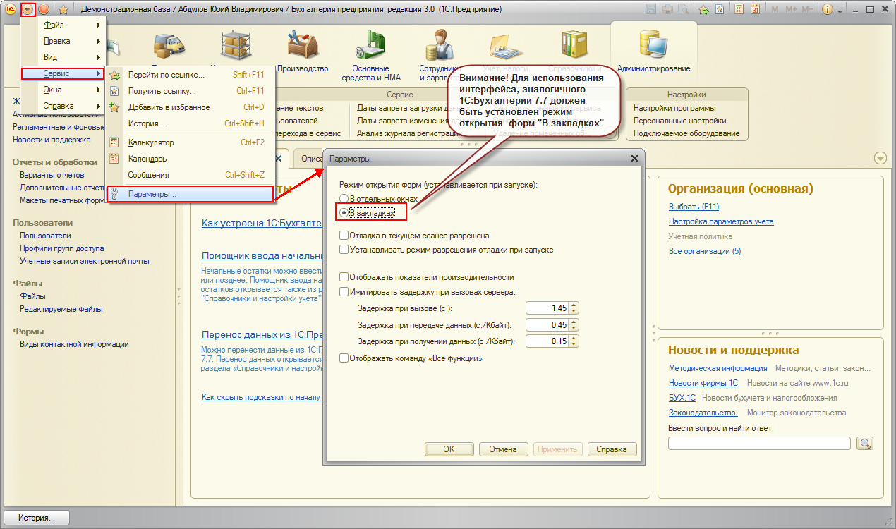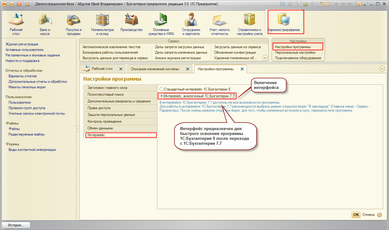 Для полноценной работы с программой следует использовать стандартный интерфейс 1С: Бухгалтерии 8
