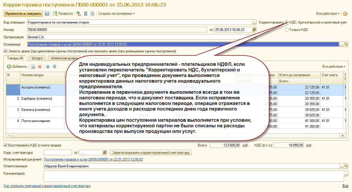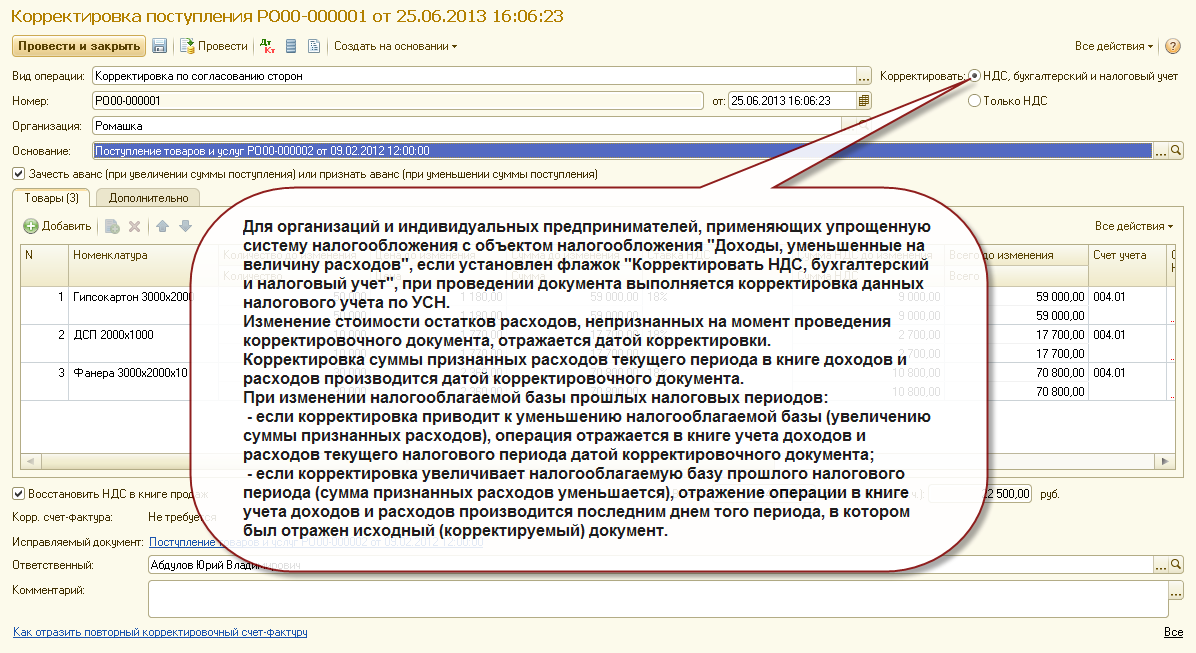 Поддерживается корректировка поступления и корректировка реализации по договорам в условных единицах. Поддерживается отражение корректировки поступления и корректировки реализации в учете НДС, бухгалтерском и налоговом учете индивидуальных предпринимателей - плательщиков НДФЛ. Поддерживается отражение корректировки поступления и корректировки реализации в бухгалтерском и налоговом учете организаций и индивидуальных предпринимателей, применяющих упрощенную систему налогообложения.