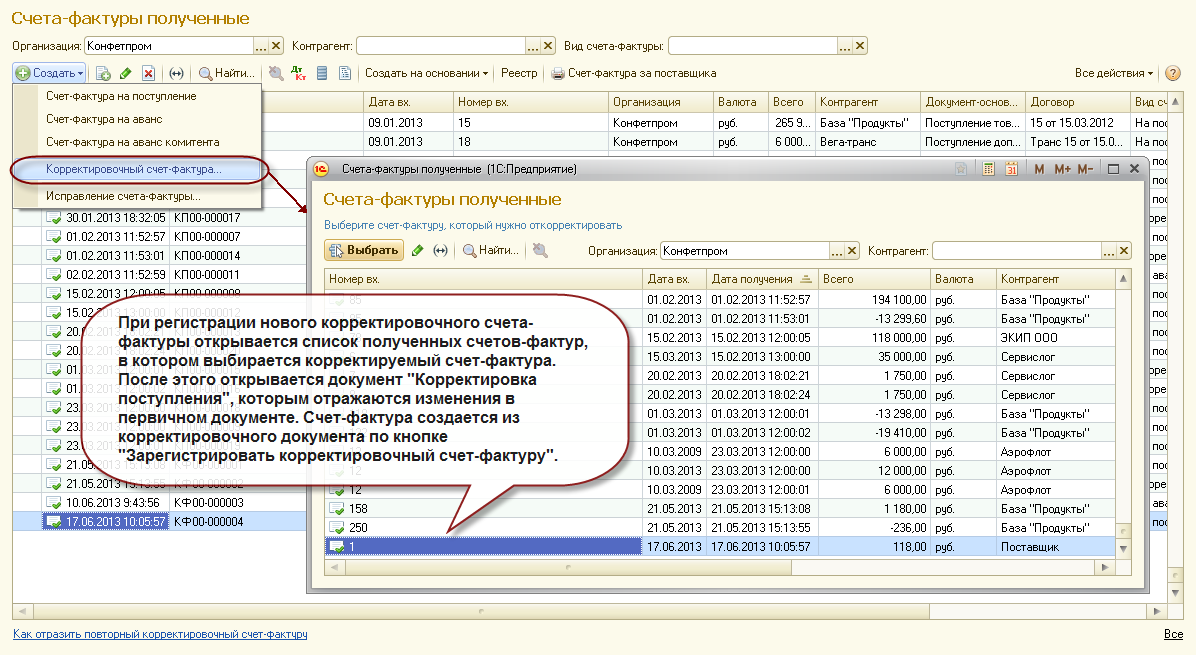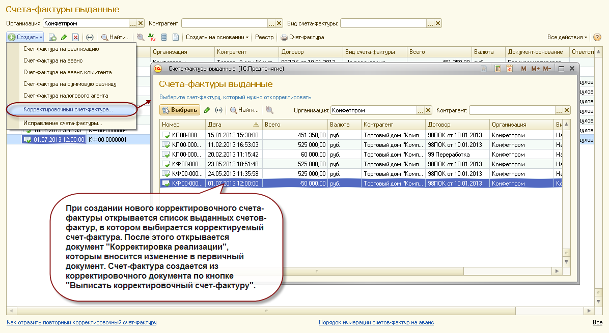Упрощен процесс регистрации корректировочных (исправленных) счетов-фактур. Для формирования необходимых корректировочных документов с заполненными реквизитами достаточно указать счет-фактуру, который необходимо откорректировать (исправить).
