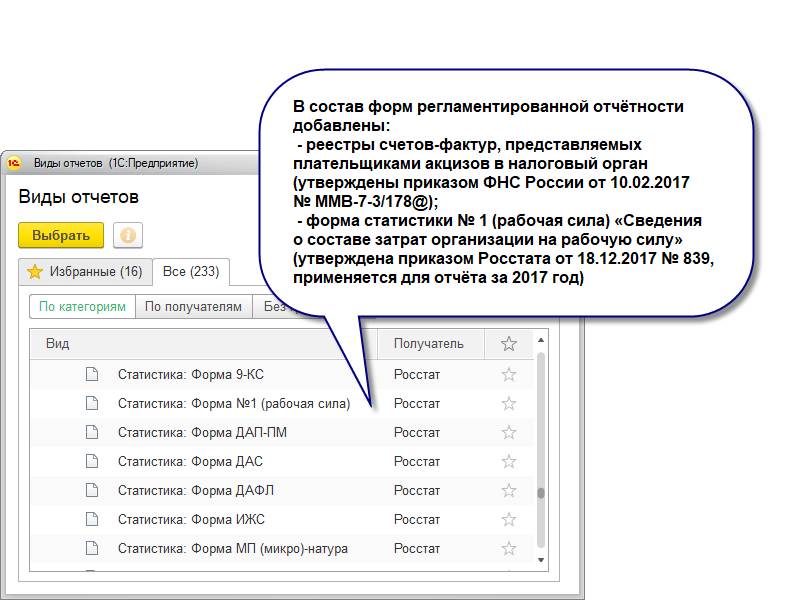 Для формы статистики № 1-услуги «Сведения об объеме платных услуг населению» в редакции приказа Росстата от 13.12.2017 № 824 реализована выгрузка в электронном виде в соответствии с XML-шаблоном от 21.12.2017, опубликованным 12.01.2018.