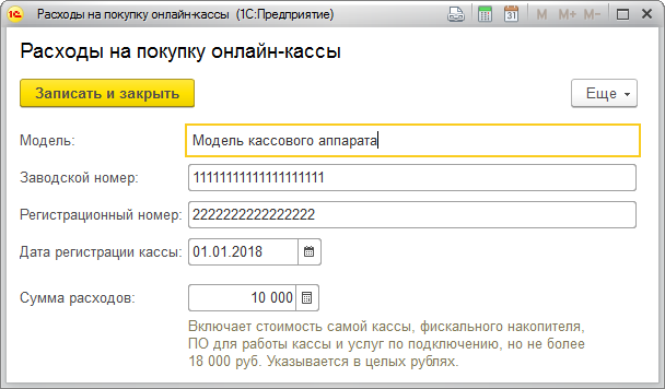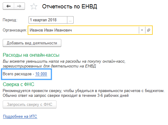 В документе можно указать сведения о купленной и зарегистрированной в ИФНС онлайн-кассе и сумме расходов на ее приобретение. Документ открывается из помощника подготовки отчетности по ЕНВД по ссылке "Добавить сведения о расходах" в группе "Расходы на онлайн-кассы".