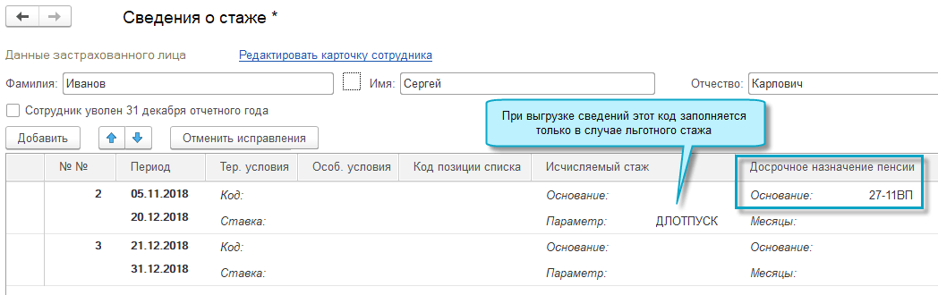 При выгрузке Сведений о стаже код "ДЛОТПУСК" будет указан, только если у сотрудника есть особые условия труда или основание досрочной пенсии (за исключением кодов 27_ГД, 27-ГДХР, 27-ПД, 27-ПДРК, 27-СМ, 27-СМХР).