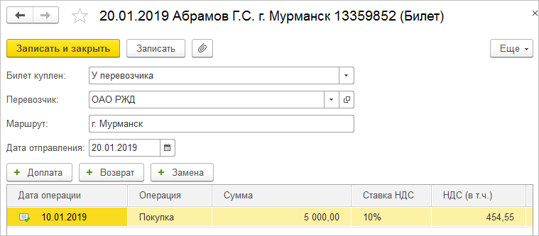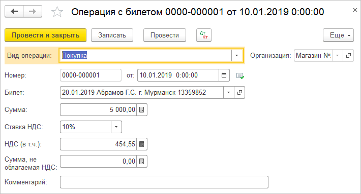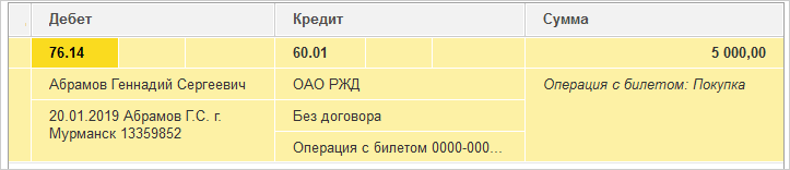 Приобретение билетов отразится по дебету счета 76.14 "Приобретение билетов для командировок" при проведении документа "Операции с билетами".